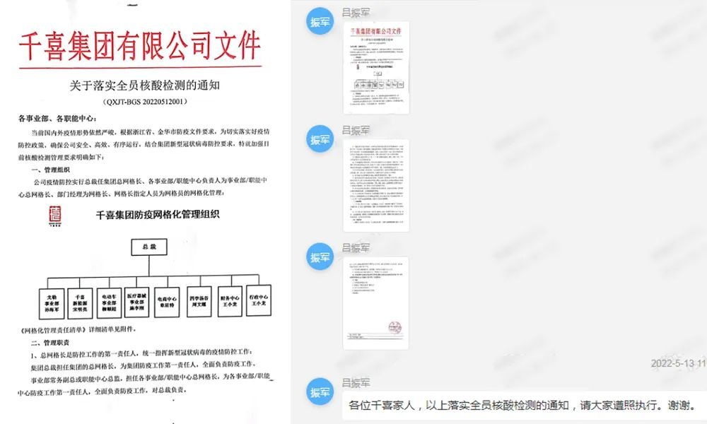 為進一步落實全員核酸檢測,千喜集團建立健全疫情防控網格化管理責任制,集團總裁擔任總網格長,構建起集團到事業部、事業部到部門、部門到員工的疫情防控網絡,形成責任明確、協調有序、監管嚴格、常態長效的網格化管理機制。