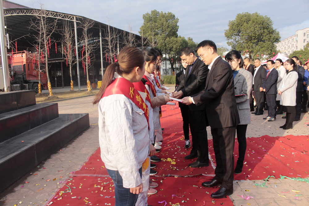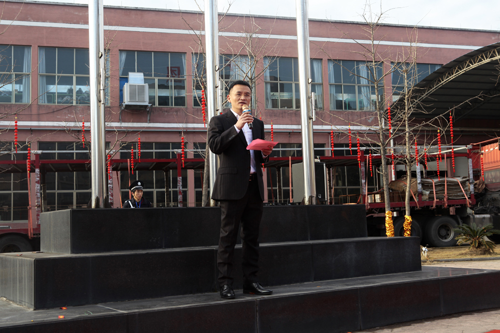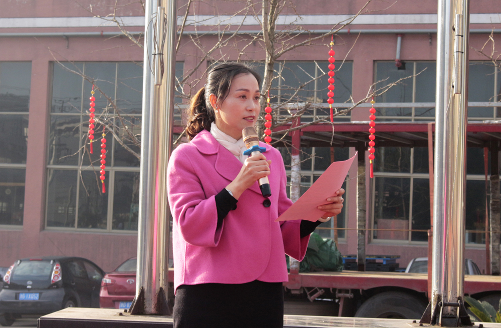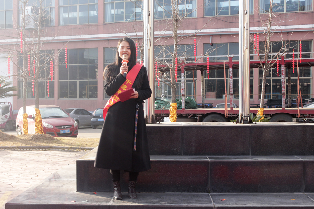 首先,進(jìn)行的是升國旗儀式。當(dāng)雄壯激昂的國歌奏響時,五星紅旗徐徐升起、迎風(fēng)飄揚(yáng),全體人員莊嚴(yán)地向國旗行注目禮。禮畢后,千禧龍纖事業(yè)部總經(jīng)理陳宏則作為各事業(yè)部總經(jīng)理的代表,上臺發(fā)表致辭。致辭中,陳宏總結(jié)了2019年度千喜集團(tuán)各事業(yè)部取得的成就與收獲,肯定了全體人員的辛勤付出和努力,并對大家的付出表示衷心感謝。同時,對于2020年度的多個“小目標(biāo)”,他也許下了自己的期許,希望在全體人員的努力下,各事業(yè)部都能在各自的行業(yè)中熠熠發(fā)光,不斷朝著既定的目標(biāo),努力前進(jìn),實(shí)現(xiàn)千喜集團(tuán)的價值,實(shí)現(xiàn)千喜人的價值。