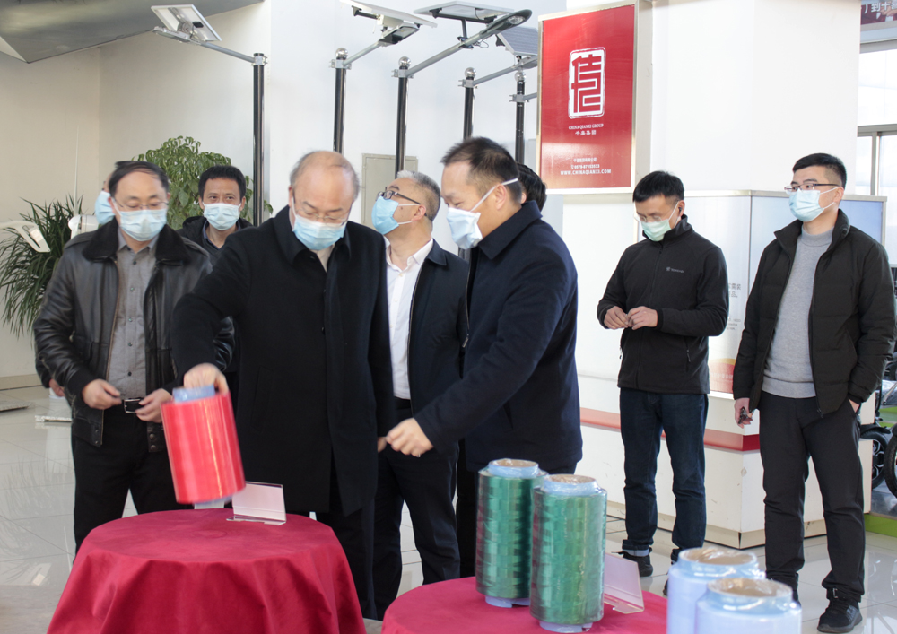 在集團(tuán)董事長(zhǎng)姚湘江等公司高層的陪同下,尹學(xué)群市長(zhǎng)、張群環(huán)市長(zhǎng)一行先后參觀了集團(tuán)展廳和千禧龍纖的生產(chǎn)車間。參觀集團(tuán)展廳時(shí),尹學(xué)群市長(zhǎng)、張群環(huán)市長(zhǎng)一行詳細(xì)了解了集團(tuán)旗下各子公司的產(chǎn)品線,并針對(duì)各個(gè)系列產(chǎn)品的應(yīng)用領(lǐng)域、延伸產(chǎn)品等方面,與隨行領(lǐng)導(dǎo)展開討論與交流。參觀生產(chǎn)車間時(shí),則詳細(xì)的詢問了復(fù)工后的生產(chǎn)情況及現(xiàn)場(chǎng)防疫管控工作的執(zhí)行情況。在與尹學(xué)群市長(zhǎng)、張群環(huán)市長(zhǎng)一行交流的過程中,姚湘江董事長(zhǎng)對(duì)復(fù)工復(fù)產(chǎn)后的生產(chǎn)情況逐一進(jìn)行了匯報(bào),并詳細(xì)說明了集團(tuán)推行的各項(xiàng)防疫措施。