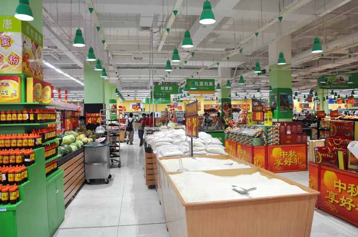 超市各區(qū)裝修風(fēng)格迥異。因此,在滿足照度標準的前提下,燈具及光源的選擇盡可能體現(xiàn)不同區(qū)域的建筑裝修特色。